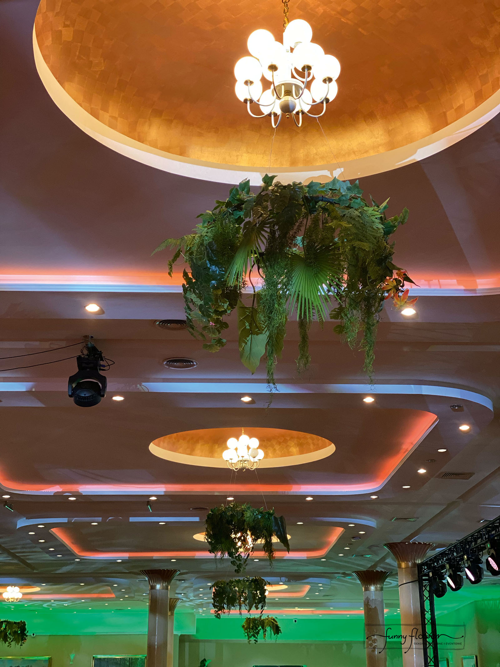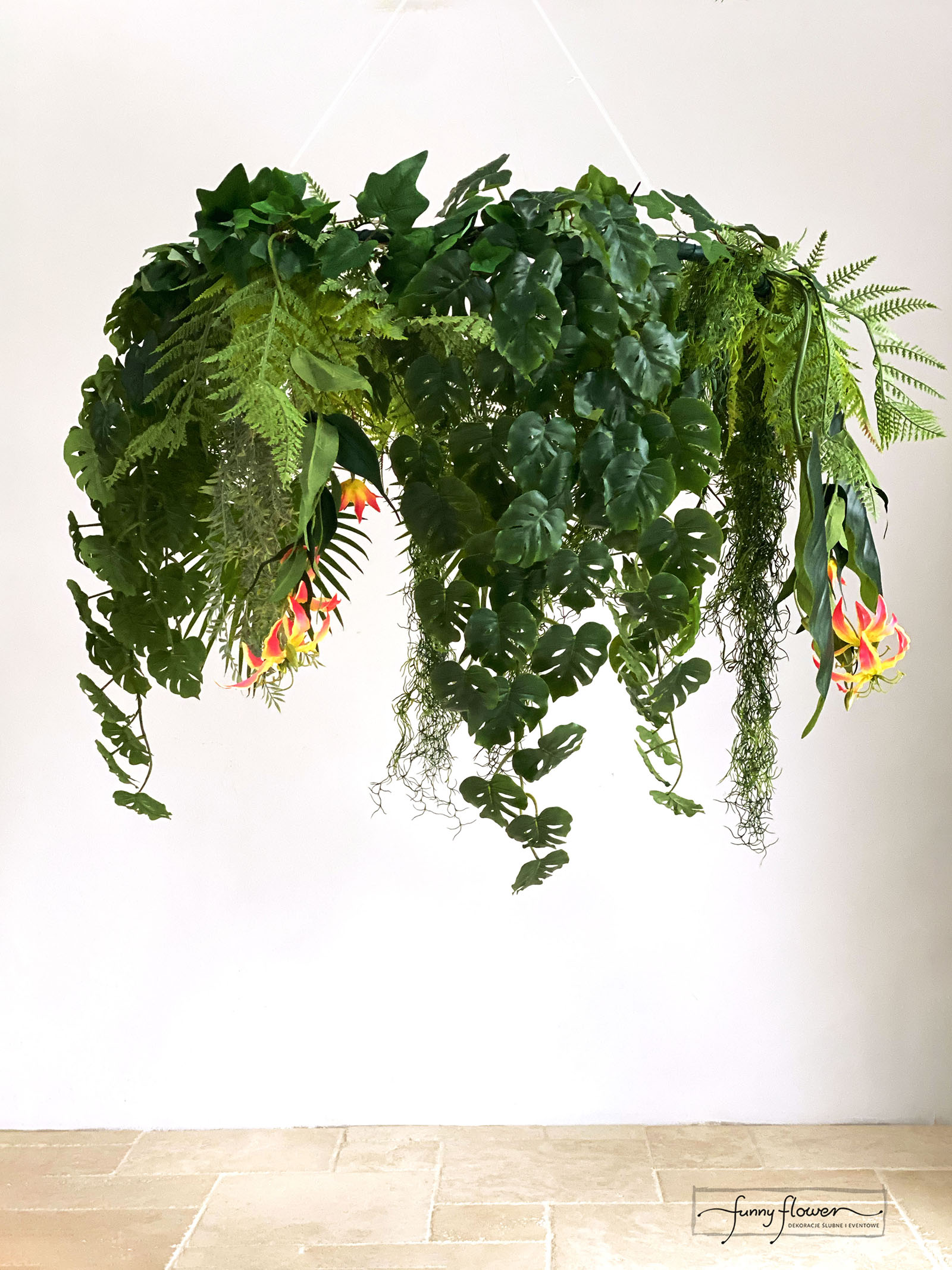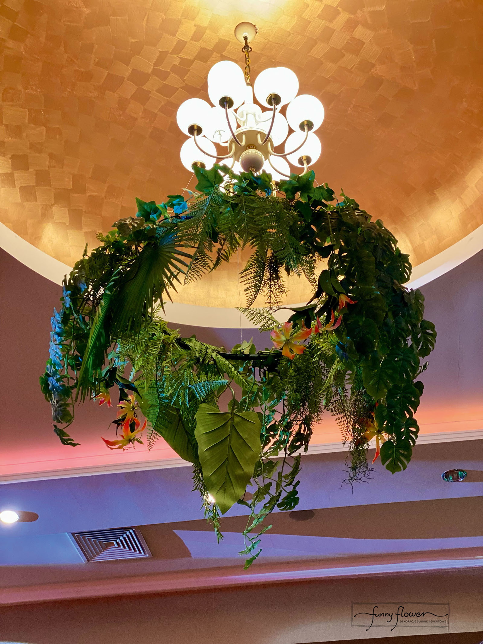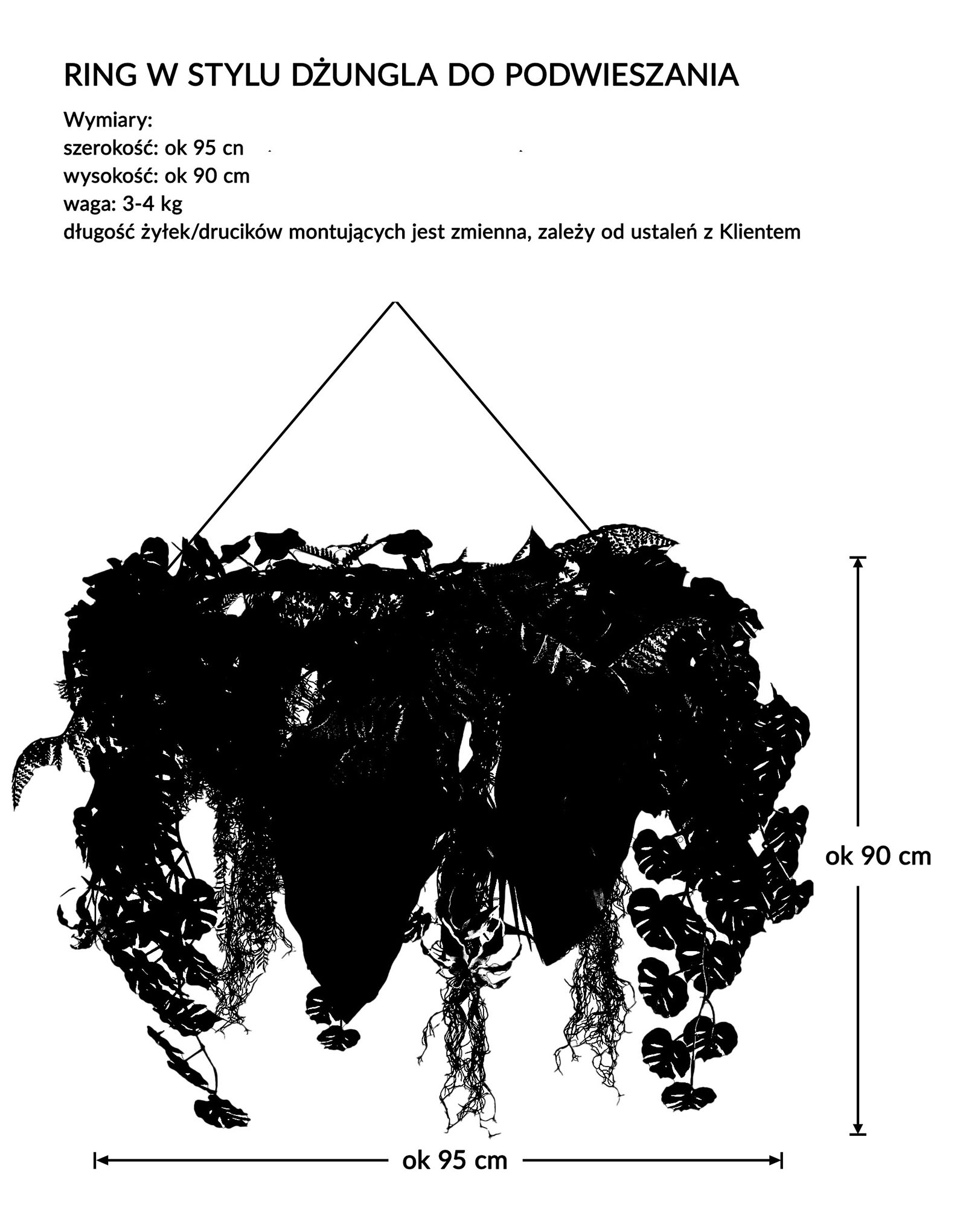 Ringi Podwieszane Dżungla służą do ozdabiania np. sali konferencyjnej, sali balowej czy hali targowej. Mogą być też zamontowane w plenerze np. do drzewa lub w namiocie eventowym. Dekoracja jest wykonana wyłącznie ze sztucznych roślin.